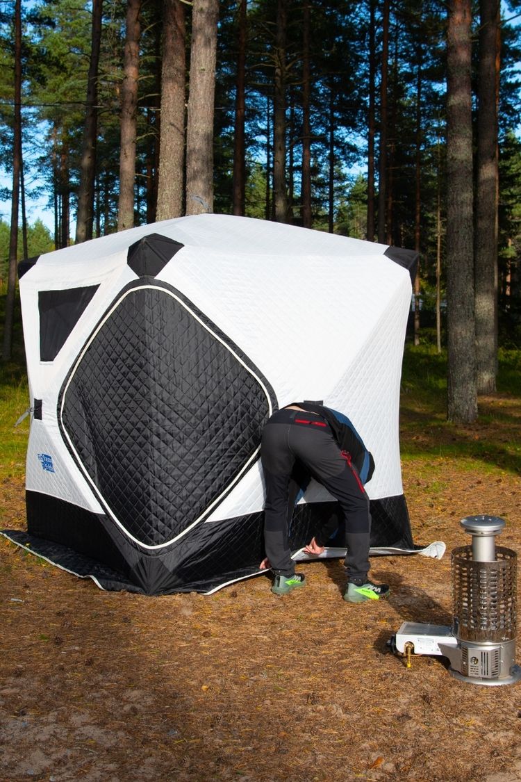 The dark green floor is attached with Velcro and must be removed when using the tent as a sauna - to ensure safety.